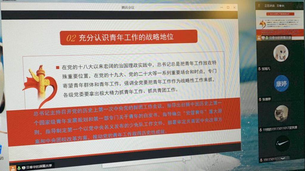 为学习贯彻习近平新时代中国特色社会主义思想,深刻认识党的青年工作的重要地位、目标任务、职责使命、实践要求,深刻了解新时代培养什么样的青年、怎样培养青年,建设什么样的共青团、怎样建设共青团等。7月30日,公共卫生学院学生第一党支部在腾讯会议线上开展“新时代党的青年工作的根本遵循”主题党课。本次党课由桂林医学院公共卫生学院副院长贝春华同志授课,支部全体党员参加。