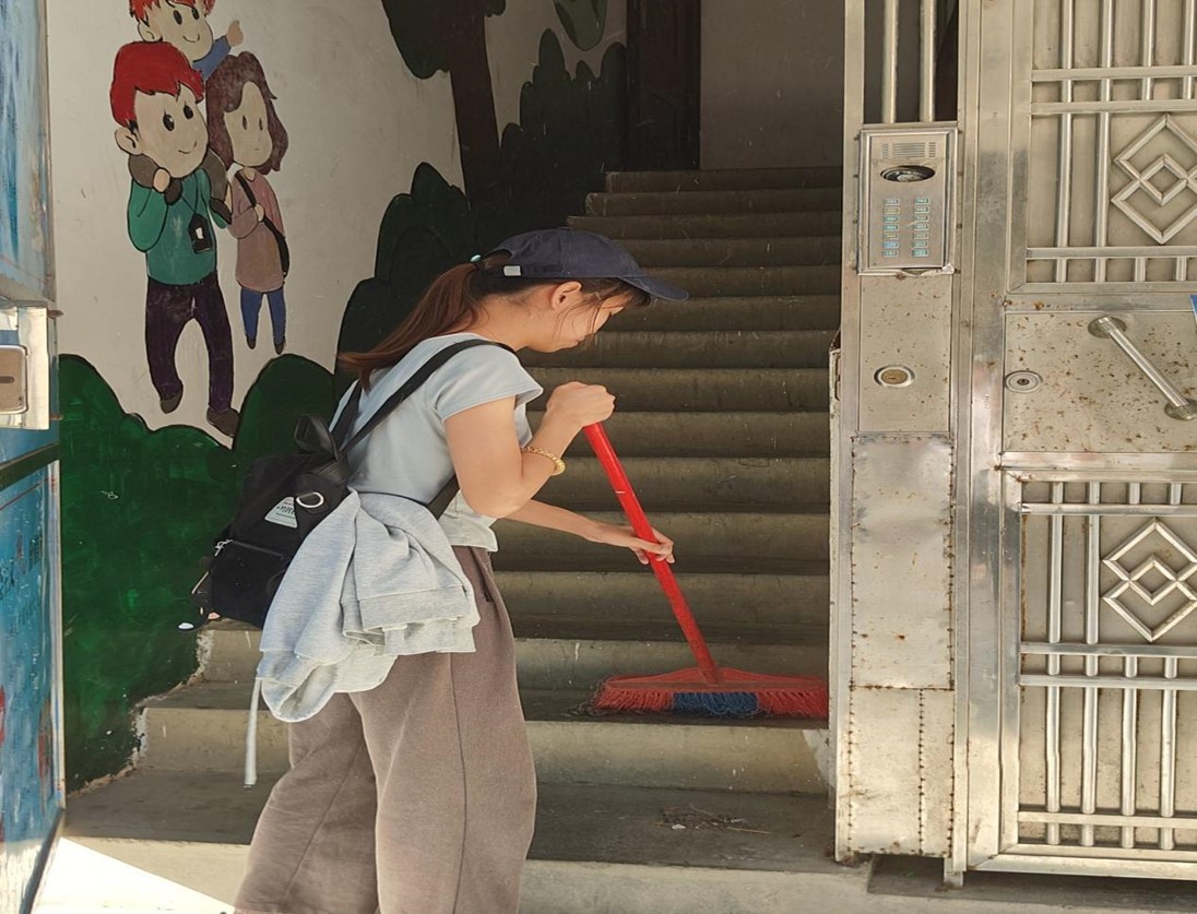 同学们有序组织,拿着扫把拖把前往本组楼道清洁任务,同学们分工明确,有的同学负责扫地、有的同学负责拖地、有的同学负责打水;清洁过程中,同学们和居民其乐融融的交流,居民和居委会的工作人员也非常感谢我们的付出,同学们纷纷洋溢着笑容;清洁结束后,居委会工作人员给同学们买了一箱水表示感谢,同学们也在最后的合影中结束了本次的实践任务。