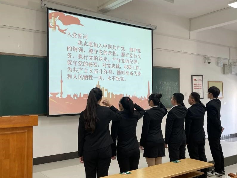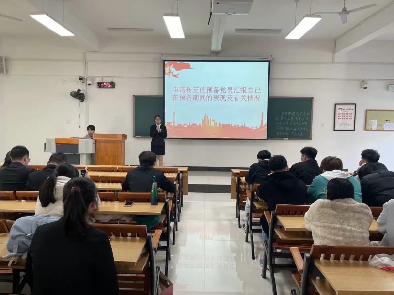 会议伊始,由支部书记邹海凡同志带领党员同志们学习《习近平新时代中国特色社会主义思想专题摘编》第十章“铸就社会主义文化新辉煌”和《中国共产党党徽党旗条例》。随后,大会严格按照发展党员程序进行。首先由刘瀚元、廖覃凤等6名预备党员汇报自己在预备期间的表现及有关情况;其次,入党介绍人介绍刘瀚元、廖覃凤等6名同志在预备期间的表现情况并提出转正意见;接着,由麦倬榕同志代表支部委员会向支部大会介绍刘瀚元、廖覃凤等6名同志在预备期间教育和考察情况并提出转正意见;与会党员认真聆听,对刘瀚元、廖覃凤等6名同志的转正问题进行讨论、发表意见;经支部全体正式党员无记名投票表决,刘瀚元、廖覃凤等6名同志均全票通过,同意刘瀚元、廖覃凤等6名同志按期转为中共正式党员,并进行入党宣誓。
