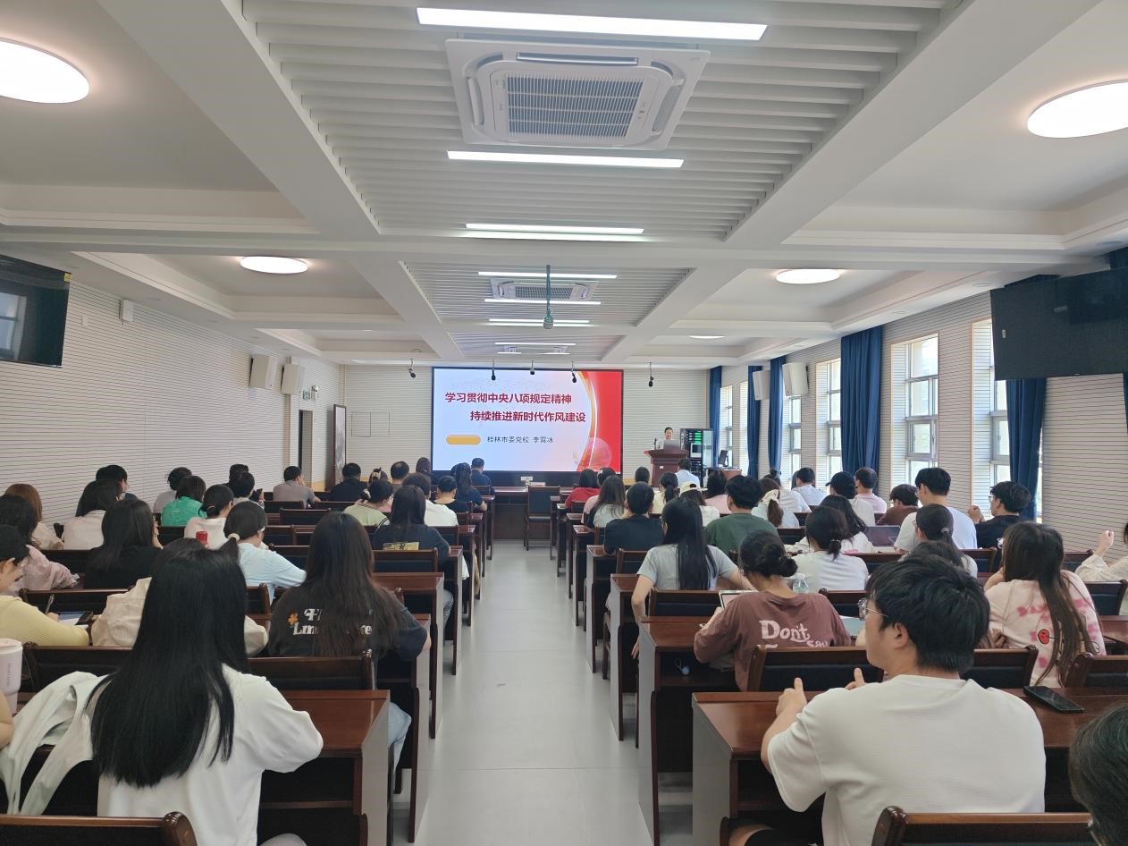 2025年5月13日,桂林医科大学公共卫生学院在公卫楼217会议室举办深入贯彻中央八项规定精神学习教育专题讲座,特邀桂林市委党校李霄冰教授为全院师生党员作专题辅导。学院领导班子成员、师生党员代表90余人参加活动。