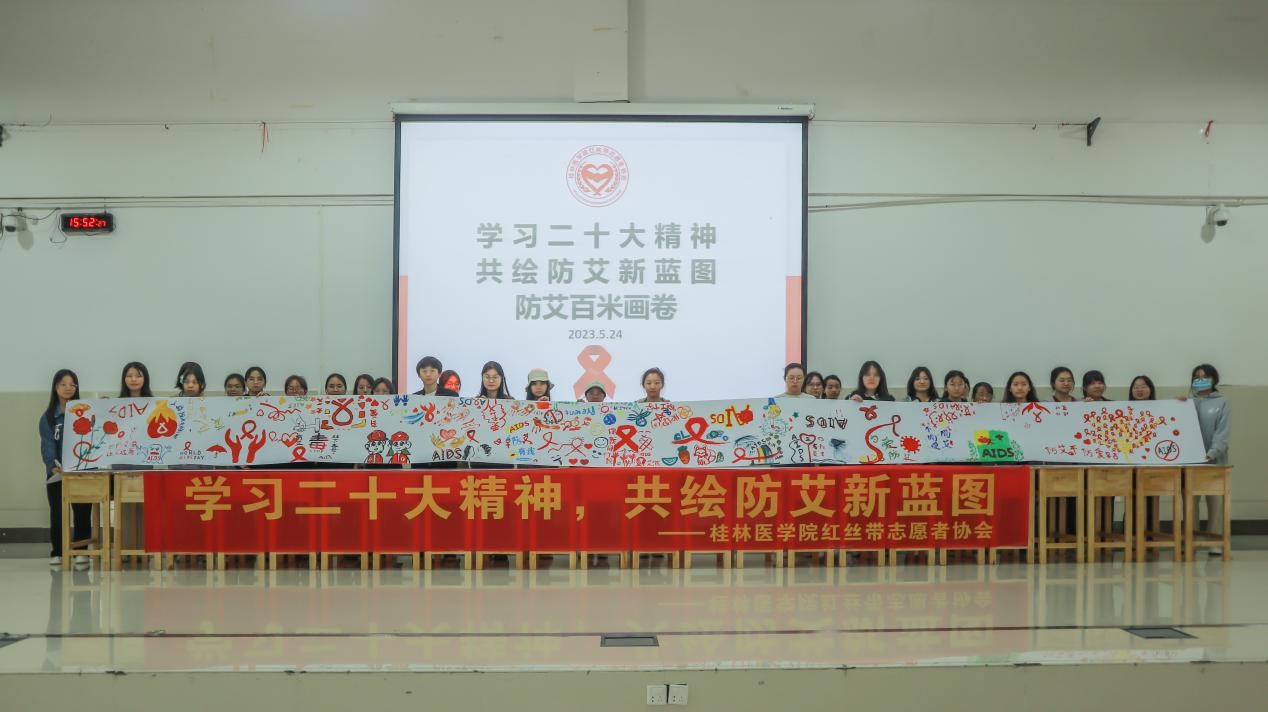 为落实学习贯彻党的二十大精神,进一步加强我校大学生的艾滋病预防教育工作,不断提高其防艾意识和防艾能力,桂林医学院公共卫生学院于2023年5月24日下午15:00在桂林医学院南楼报告厅举办了题为“学习二十大精神,共绘防艾新蓝图”的防艾百米画卷活动。