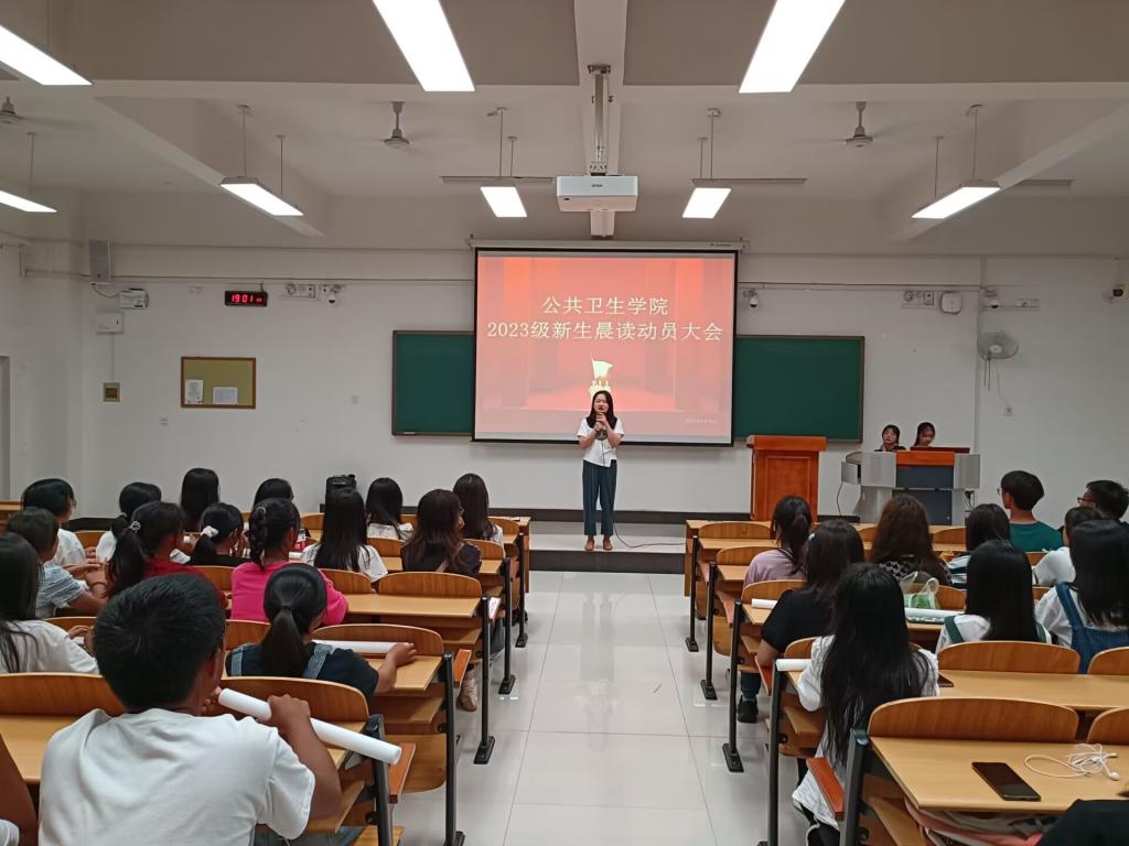为调动2023级新生学习积极性,促使大家养成良好的学习习惯,传承我院晨读的优良传统,营造我院良好的学习氛围,2023年9月14日,公共卫生学院在教学北楼304教室举办了2023级新生晨读动员大会。2023级新生辅导员徐益彩和全体新生参与本次活动。