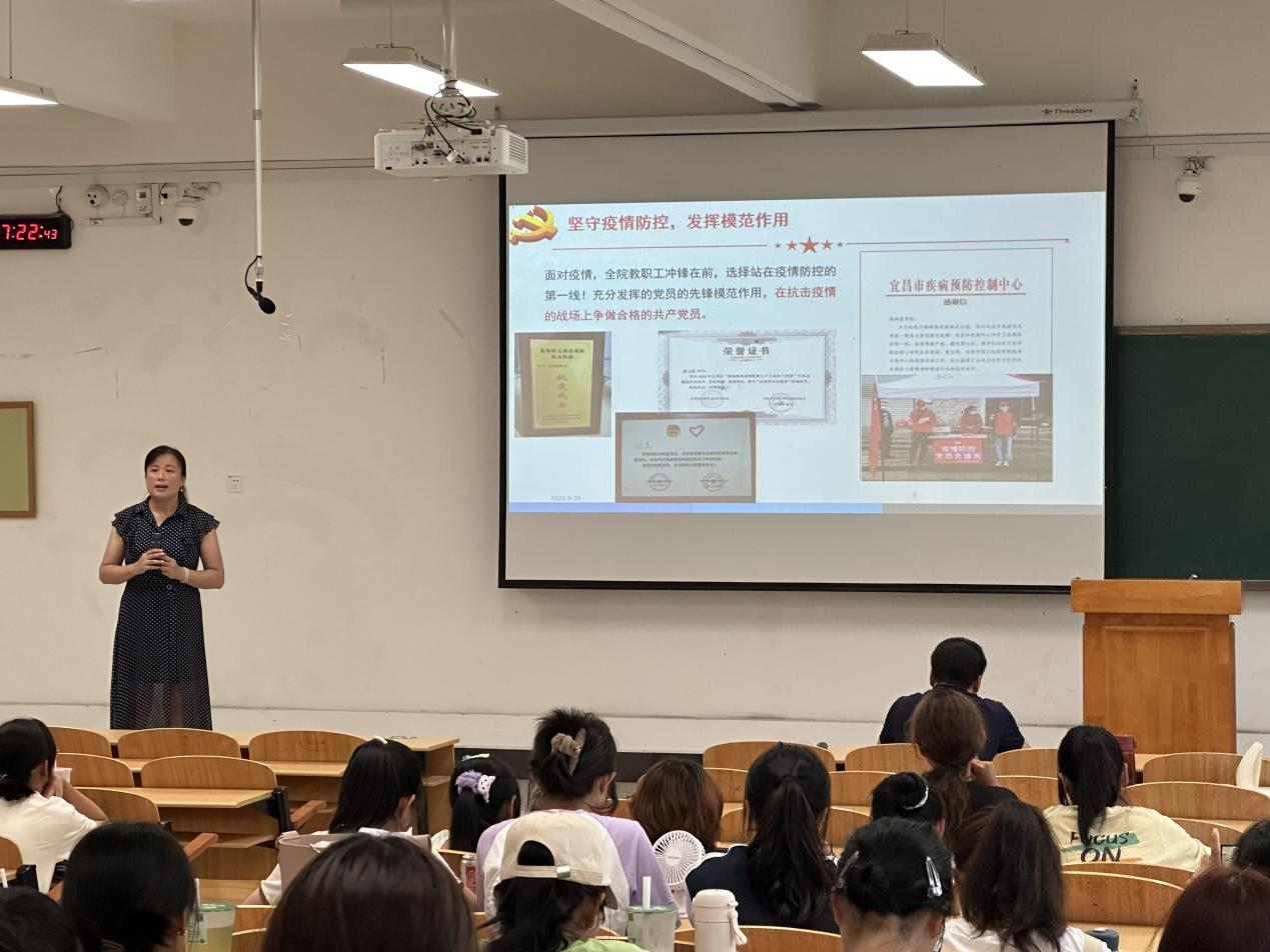 会议第一项,邓娜书记先是从桂林医学院的历史出发向同学们详细地介绍了学校基础设施和丰富的学习资源,以及近年来学校、学院取得的辉煌成果。以此引导同学们积极向党组织靠拢,要“扣好人生的第一粒扣子”,从大一就进行有目的有计划的考研考博准备,并向大家分享了疫情期间积极参加志愿工作的优秀党员以及优秀学长关均元努力减重为4岁儿童捐献造血干细胞等众多光荣事迹,让同学们以此为榜样,向他们学习。此外,邓娜书记还跟同学们讲述了入党流程、入党条件。