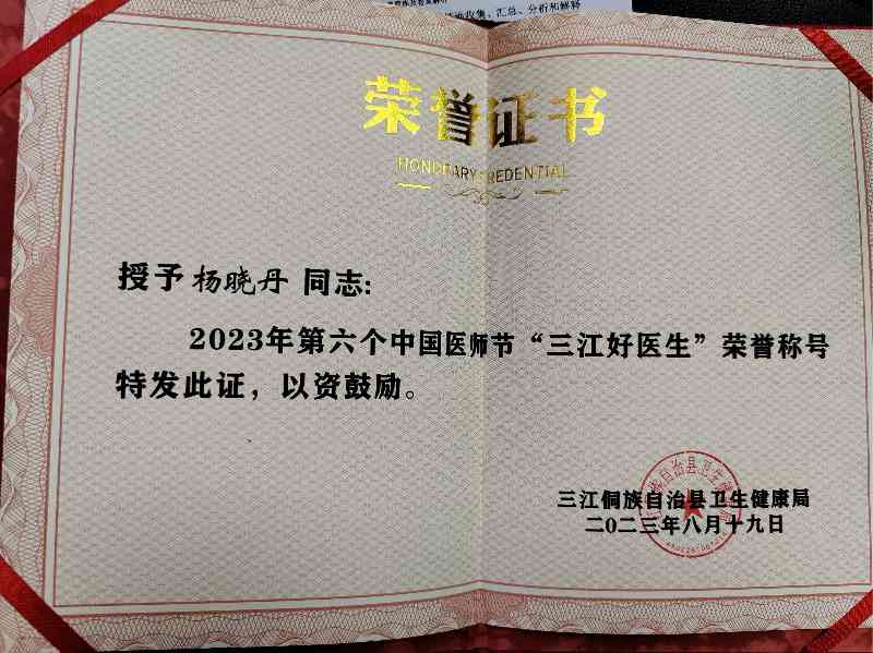 2020年和2023年,她因工作成绩显著,被两次评为三江县“好医生”称号。