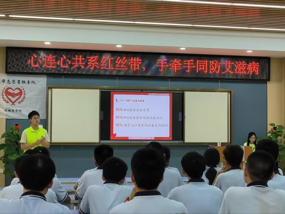 为了进一步增强全民健康意识,强化艾滋病防治宣传教育成果,桂林医学院红丝带志愿者服务队于2023年10月24号在临桂中学展开了以“心连心共系红丝带,手牵手同防艾滋病”为主题的宣讲活动