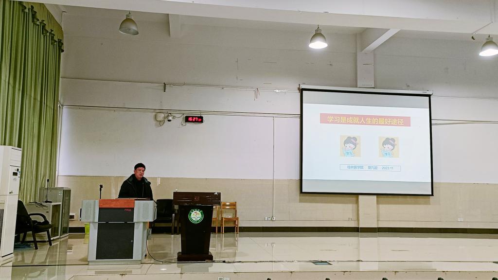 为进一步加强大学生思想政治教育,学习宣传习近平新时代中国特色社会主义思想,加强大学生思想品德、人文素质和科学文化的培养和教育,11月14日,桂林医学院“关心下一代”讲坛系列活动之“学习是成就人生的最好途径”主题讲座在临桂校区教学南楼多功能报告厅举行,讲座由原公共卫生学院党委书记曾凡能主讲,离退处党委副书记李荔、学工处副处长朱四化与公共卫生学院、护理学院、人文与管理学院300余名学生聆听了讲座。