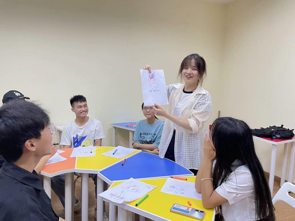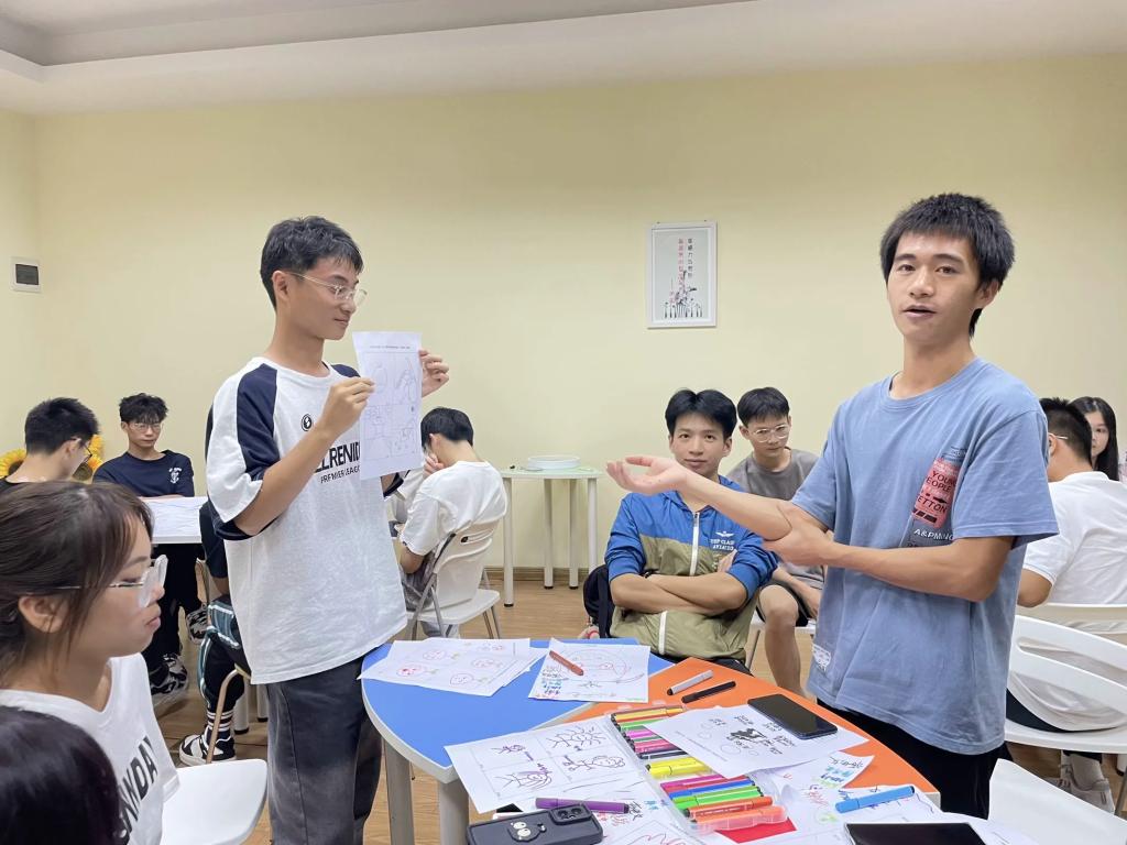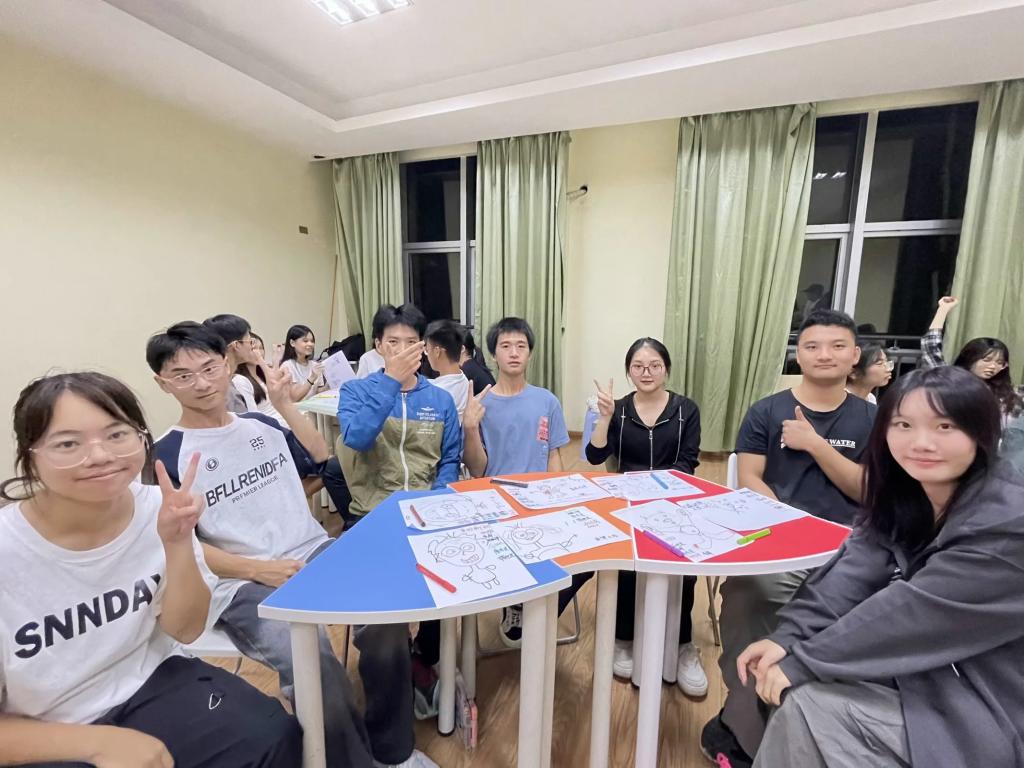 葛静结合团队目前情况,通过团体辅导、相关理论讲解,采用绘画、唱歌、素拓训练等方式,涵盖了团队合作、沟通协调、互动交流等内容,帮助同学们理解人际交往的黄金法则、白金法则、团队合作的重要性,帮助同学们对照自身、查找问题,思考接下来团队发展的努力方向。