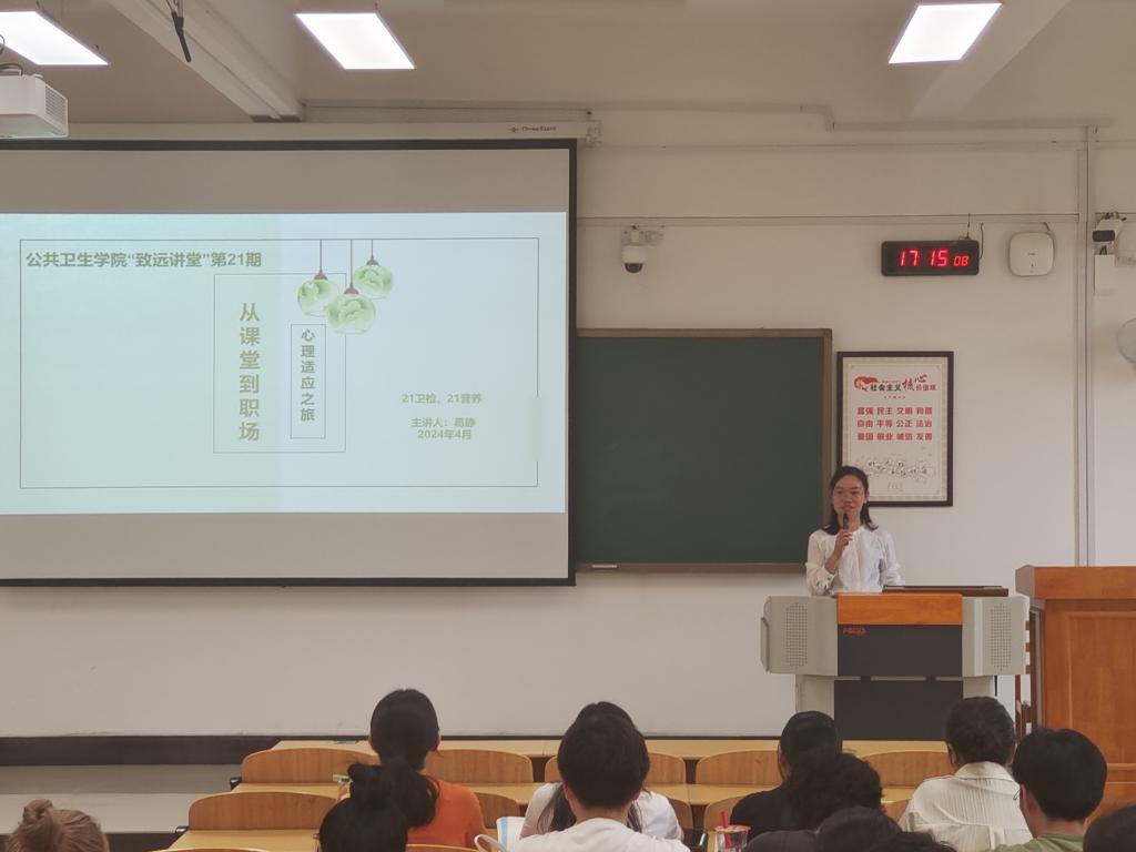 4月25日,公共卫生学院21卫检、21营养在临桂校区N209成功开展了一场主题为“从学校到职场——心理适应之旅”的学院第21期致远讲堂,本次讲堂由学工办主任葛静主讲。