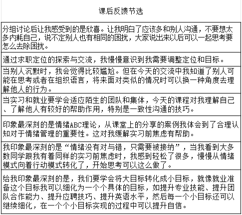 活动结束后,参与其中的学生们纷纷表示受益匪浅,对未来的职场生活更加充满信心和期待。以下是部分同学课后反馈。