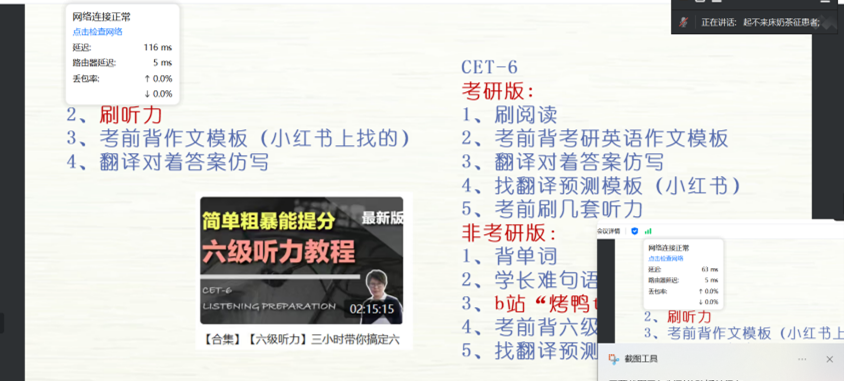 董秋霞强调了时间和精力的有效分配。她建议同学们制定详细的学习计划,并注重劳逸结合,保证身心健康。此外,学姐还推荐了一些在线资源,如B站博主的教学视频、下载考研资料途径等,供同学们参考学习。为同学们统筹了考研和找工作之间的关系,解决了同学们关于考研问题。针对英语四六级的备考,她建议同学们充分要多刷题来提高成绩,进行有针对性的训练和模拟测试。