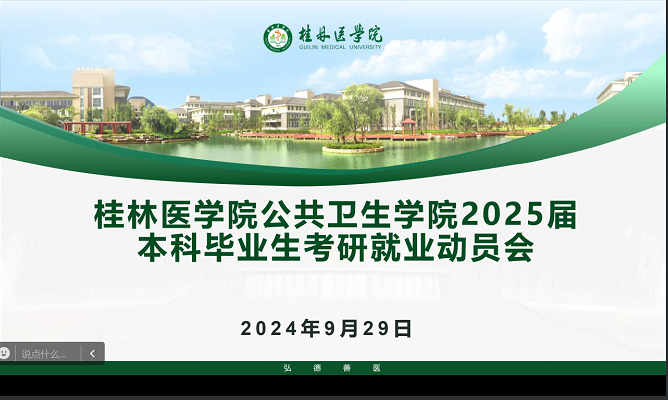 为扎实做好2025届本科毕业生考研、就业工作,帮助毕业生树立正确就业观,理性选择考研目标院校,助力实现更高质量就业,9月30日晚19点至21点,公共卫生学院通过通讯会议的形式,召开两场“2025届毕业生考研就业动员会”。学院党政领导班子全体成员、毕业生辅导员以及2025届本科毕业生参加会议。会议由学院曾怀才院长主持。
