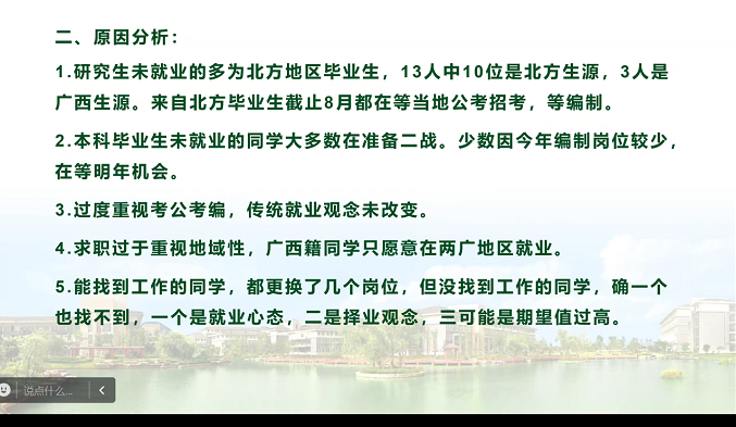 曾怀才院长结合2024届毕业生就业状况,从内外因角度进一步分析了形势,传递了忧虑,也表达了期望。同时,他也列举了学院2024届选调生、西部计划志愿者、扎根边疆就业的先进典型与大家分享。他指出,当前形势虽然不容乐观,但只要端正就业态度、找准目标、高度重视、提升能力,将“小我”规划融入时代发展潮流之中,融入区域和国家的“大我”之中,在实践中找到真正的自我价值。
