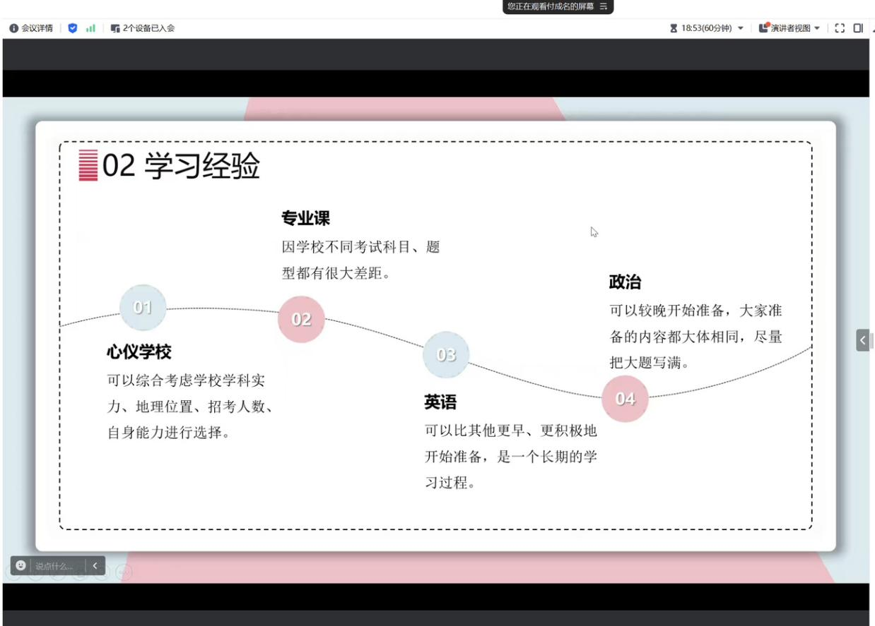 朋辈导师付成名指出当今社会竞争激烈,考研和考公成为许多大学生追求更高目标的重要途径,她首先提醒大家要明确自己的目标,不仅包括选择合适的专业或岗位,还要了解各自的考试要求以及历年的考试内容和趋势,制定好详细的学习计划,根据自身的时间安排和学习节奏合理分配复习时间,及时调整自己的心态,接受失败和挫折,才能在不断的挑战中成长。