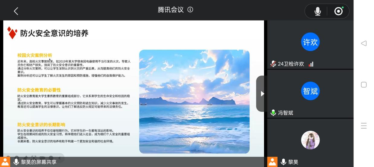 在会议上,朋辈导师黎昊从防火安全的重要性、措施、自救方法、校园管理及法律责任五个方面为同学们讲解消防知识,多方面多角度覆盖了防火安全意识,增加了同学们的防火安全以及自救意识。