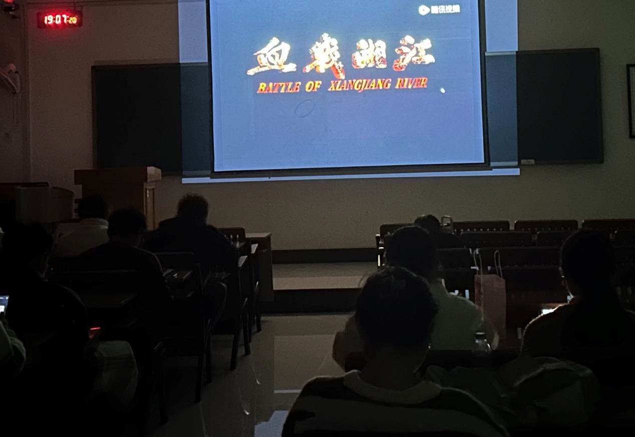 活动伊始,五位朋辈导师向同学们作自我介绍,随后带领大家观看红色经典影片《血战湘江》。影片随灯光暗下开始,真实重现湘江战役的枪林弹雨、炮火轰鸣,红军战士们面临数倍于己且装备精良的敌人,毫无惧色。在滚滚硝烟中,即使是简陋的武器、单薄的衣衫也挡不住他们坚定向前的脚步。红军为掩护大部队过江,用血肉筑起“长城”。被鲜血染红的江水,诠释着视死如归的精神。“为有牺牲多壮志,敢教日月换新天”,现场的同学们被红军精神深深触动,也深切感受到和平的可贵。影片在灯光重亮下临来尾声,观影人员一同在荧幕前合影留念,本次观影活动圆满结束。