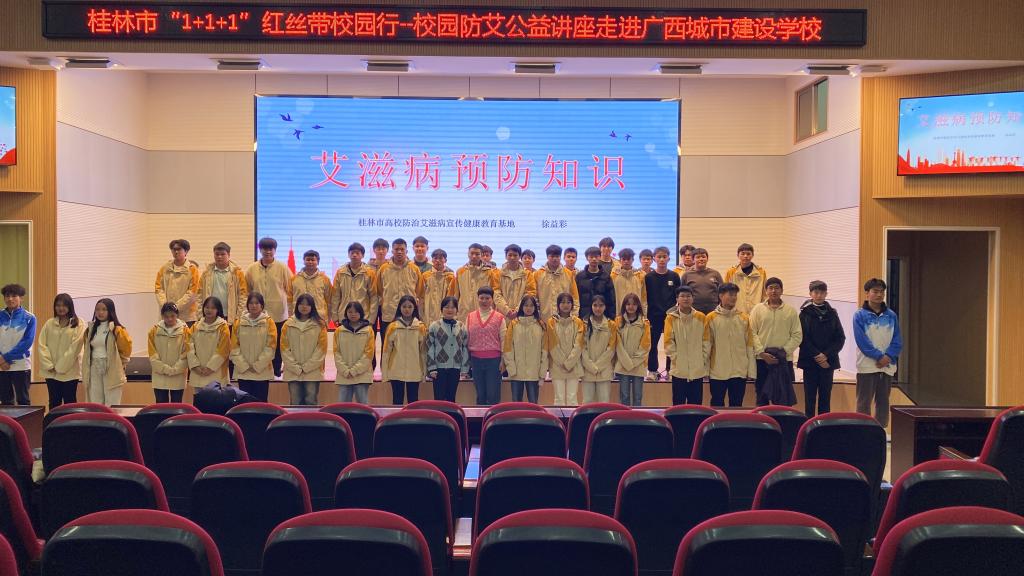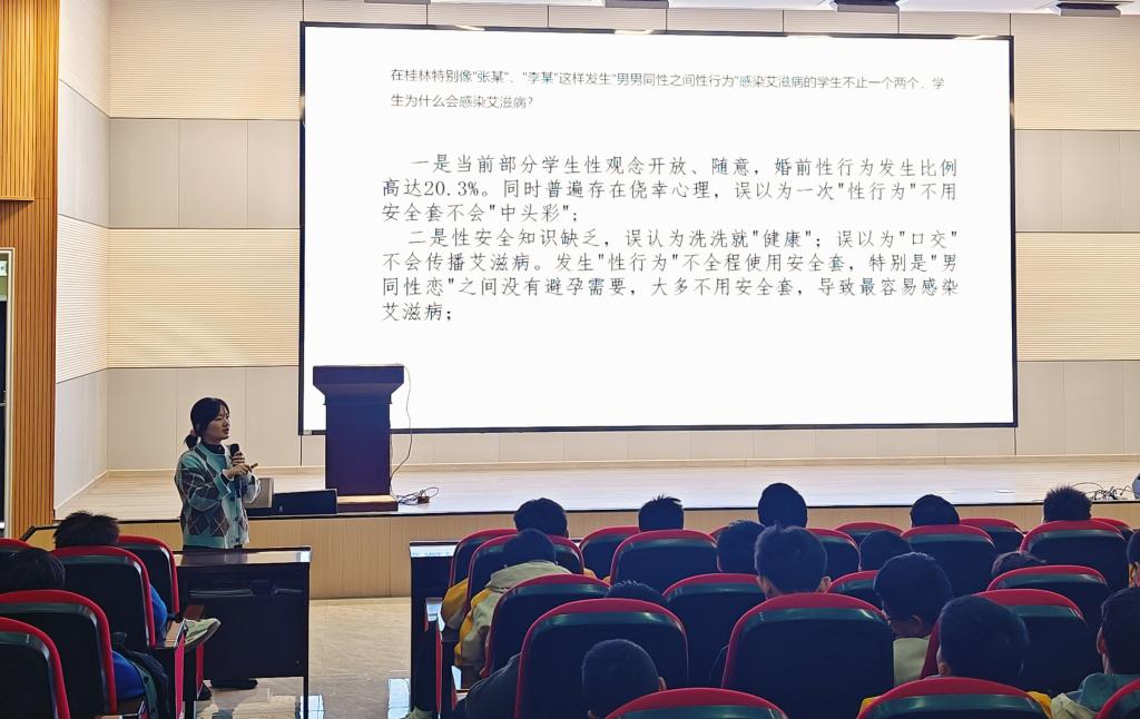 2024年11月26日,桂林市高校防治艾滋病宣传健康教育基地联合桂林市疾病预防控制中心、桂林市计划生育药具管理站在广西城市建设学校举办了主题为“凝聚社会力量,合力共抗艾滋”防艾科普讲座。本次讲座由桂林医学院公共卫生学院团委书记徐益彩主讲,200余名学生代表参加活动。