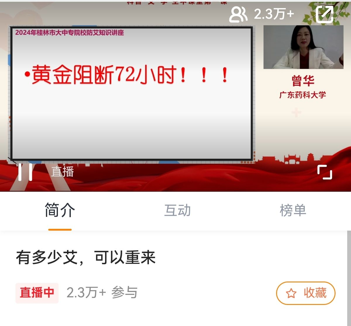 2024年12月1日至17日,桂林市卫生健康委员会、共青团桂林市委员会、桂林市计划生育协会联合主办,桂林医学院承办的桂林大中专院校“科普防艾-空中课堂”活动圆满结束。本次活动共开办两场讲座,以直播的形式面向驻桂31所大中专院校开放,由南方医科大学陈洁老师、广东药科大学曾华老师担任主讲,在线互动人数总计5.5万人次。
