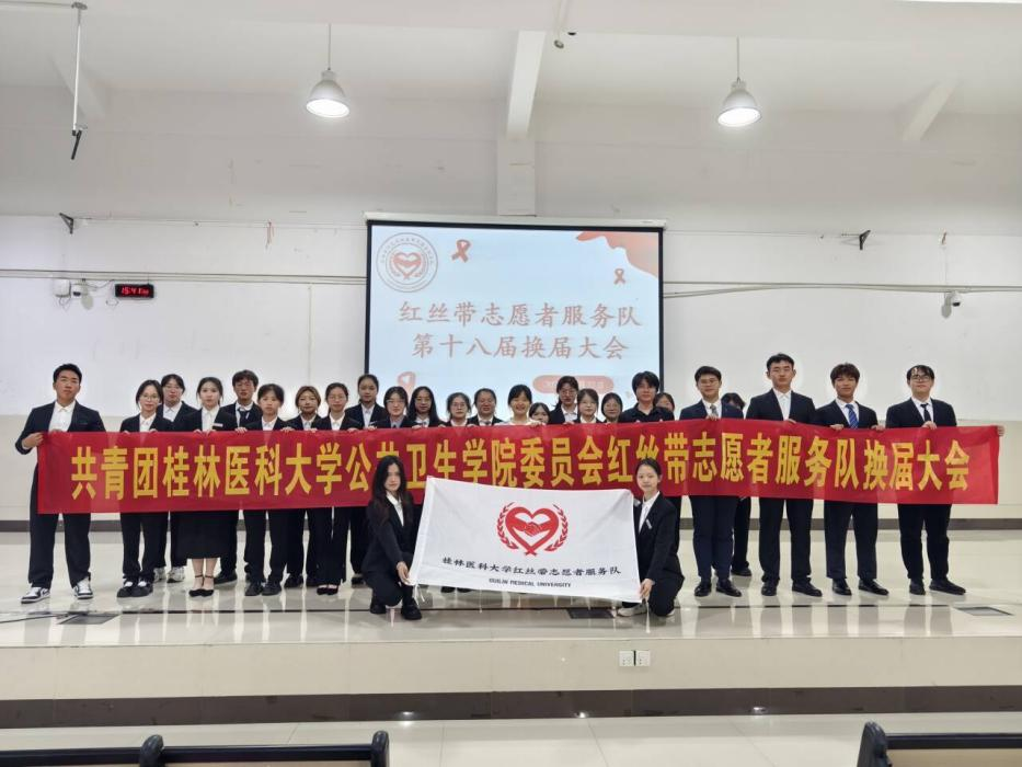 2025年5月27日,桂林医科大学红丝带志愿者服务队第十八届换届大会在临桂校区南楼多媒体报告厅成功举行,指导老师徐益彩与红丝带成员共同参加本次活动。