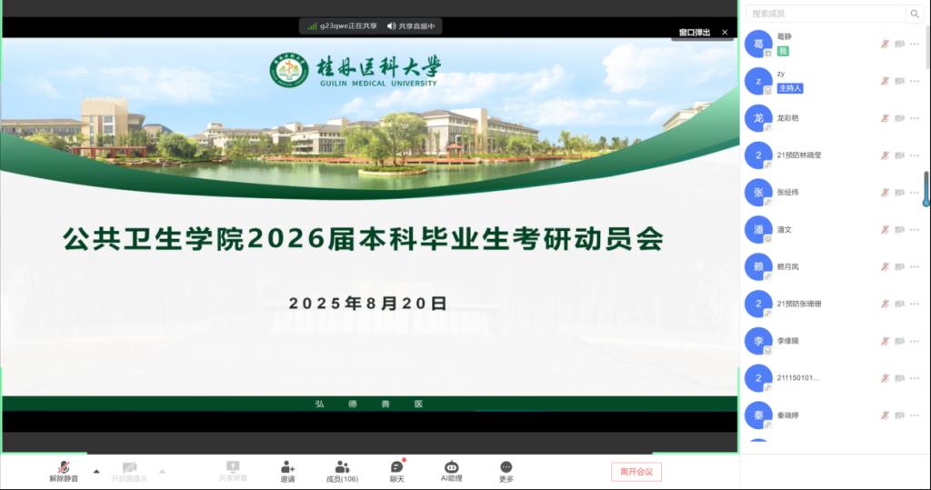 8月20日晚,公共卫生学院通过线上形式召开2026届本科毕业生考研动员会。学院党委书记贝春华、院长曾怀才、党委副书记朱四化、全体辅导员及全体2026届本科毕业生参加会议。