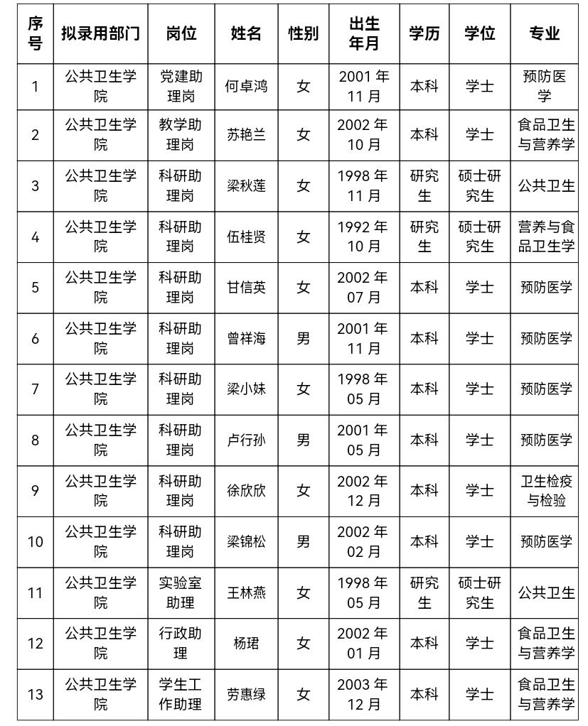 根据桂林医科大学2025年公共卫生学院助理岗位用人需求,经资格审查、考试和政审,拟录用以下人员到相应岗位工作,现将拟录用人员基本情况予以公示,公示期为5日(2025年8月12日至2025年8月16日)。