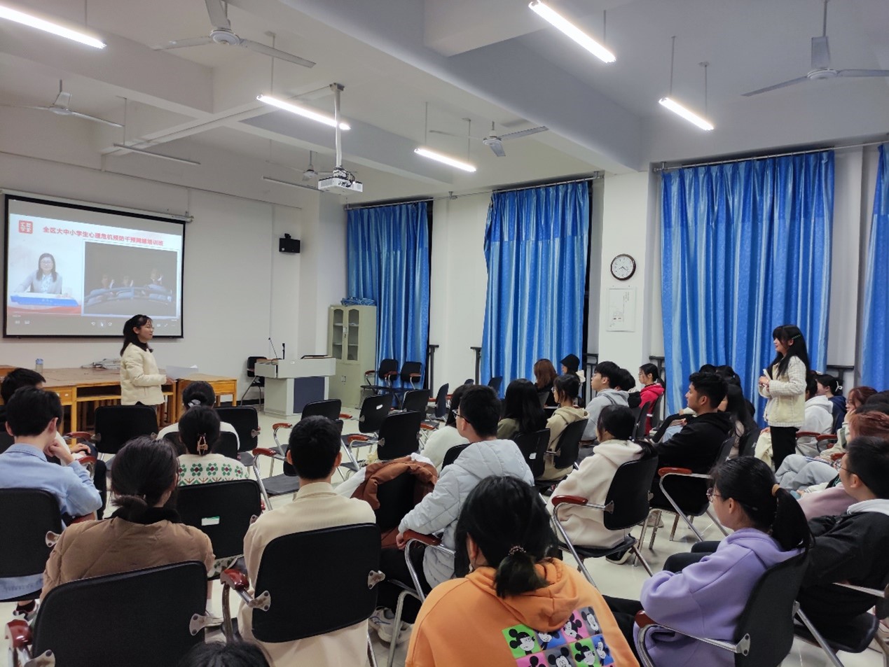 葛静首先从近期社会关注的江西某中学某学生案例引发思考,提出心理危机识别与应对的重要性,并结合心理委员与宿舍长顾虑与需求做好了心理骨干的角色定位和工作思路,接下来结合实例,采用观看视频、现场互动、现场模拟等方式讲述了需重点关注的学生类型,特别是抑郁症、精神分裂症等心境障碍的识别与应对、自杀干预的技巧等等,最后结合我校大学生心理健康教育与咨询中心的专业资源给同学们消除了对心理咨询的误解,引导学生们认同并积极宣传“求助是强者的表现”的理念,加强合作联盟。
