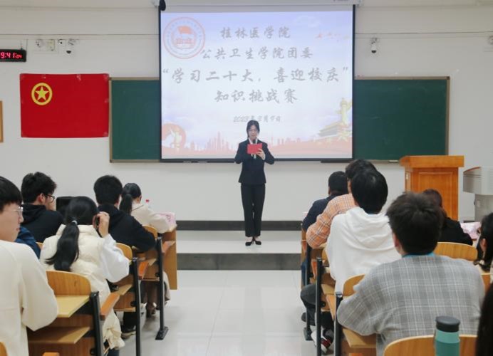 为进一步深入学习贯彻党的二十大精神,以热情饱满的精神面貌迎接我校88周年华诞的到来,共青团桂林医学院公共卫生学院委员会于2023年3月9日在教学北楼N104举办了以“学习二十大,欢喜迎校庆”为主题的知识挑战赛。公共卫生学院党委副书记张国栋、公共卫生学院团委书记徐益彩出席本次大赛。