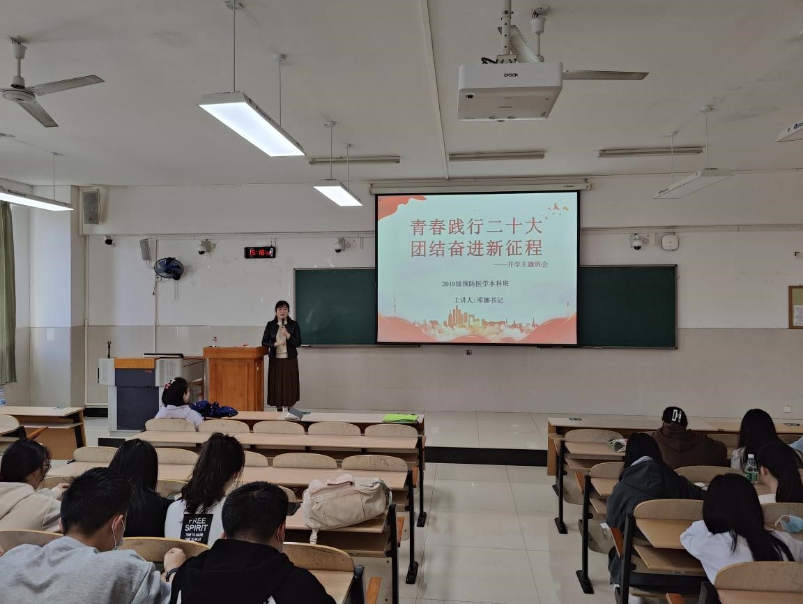 为深入落实“开学第一课”系列教育引导活动精神,3月9日下午,公共卫生学院2019级预防医学本科班在教学南楼204室开展以“青春践行二十大,团结奋进新征程”主题班会,院党委邓娜书记应邀参加。