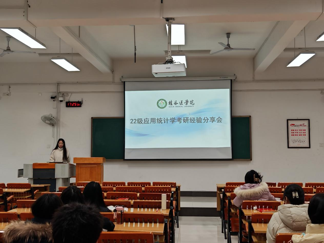 为了激发同学们对考研的热情,加强朋辈之间的引领效应,帮助同学们在备考过程中建立信心、确定方向和明确目标,22级应用统计学本科班于2024年12月26日在桂林医学院(临桂校区)教学楼N206举办了朋辈导师见面会暨考研经验分享会。本次活动由朋辈导师张杏芬、马远哲、王斌、宁甜甜组织开展,22级应统本科班全体同学参与。
