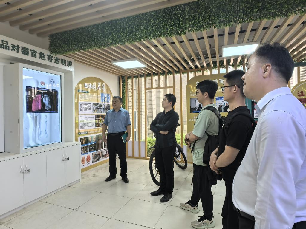 参观中,张国栋详细阐述了我校在艾滋病防控领域的学科优势与社会服务成果。高铭一行重点考察了基地的“防艾科普展示区”和“互动教育体验区”,工作人员通过多媒体演示及沉浸式设备操作,系统介绍了我国艾滋病防治现状、高校健康教育工作创新模式及基地建成以来的服务成效。高铭对基地一体化教育体系表示高度认可。