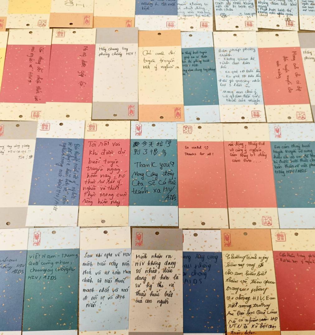 越南Quynh Coi High School校方领导对活动给予高度评价,认为宣讲内容专业实用、形式新颖易懂,为提升学生健康防护能力提供了有力支撑,并明确表达了与桂林医科大学深化跨境卫生健康合作的意愿。活动尾声,越南学生纷纷在心愿书签上写下感悟与承诺,表达对活动的认可与共抗艾滋的决心。