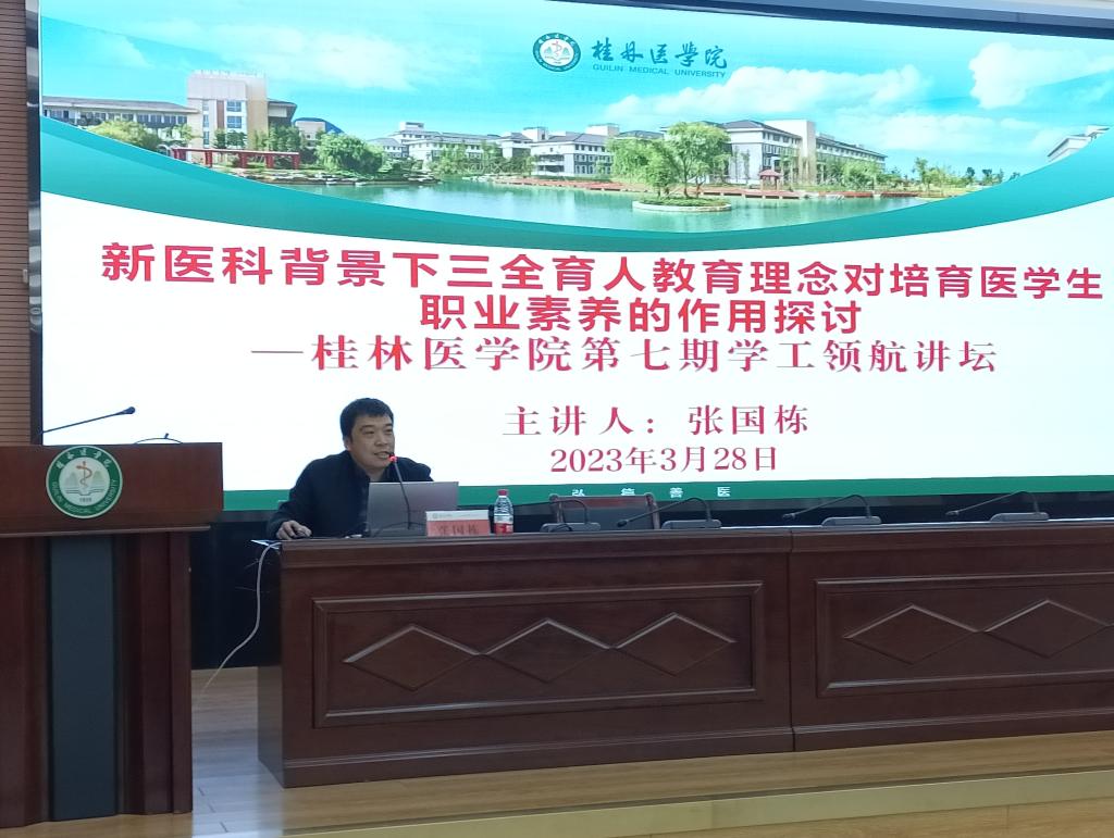 为推进学生工作队伍专业化职业化建设,高质量服务同学成长成才,3月28日下午,我校在明德楼101会议室举办第七期学工领航讲坛。公共卫生学院党委副书记张国栋作题为“新医科背景下三全育人教育理念对培育医学生职业素养的作用探讨”的专题报告。学生工作部、研究生工作部和校团委全体人员,各二级学院(系)分管学生工作负责人,全体专兼职辅导员参加活动。