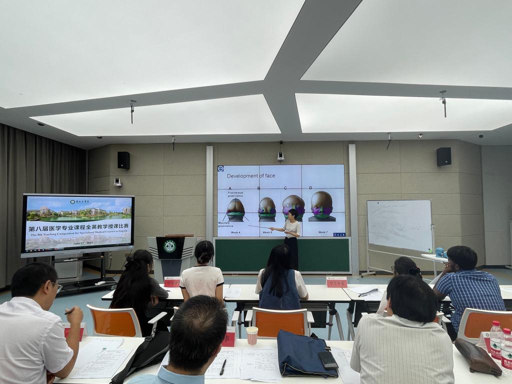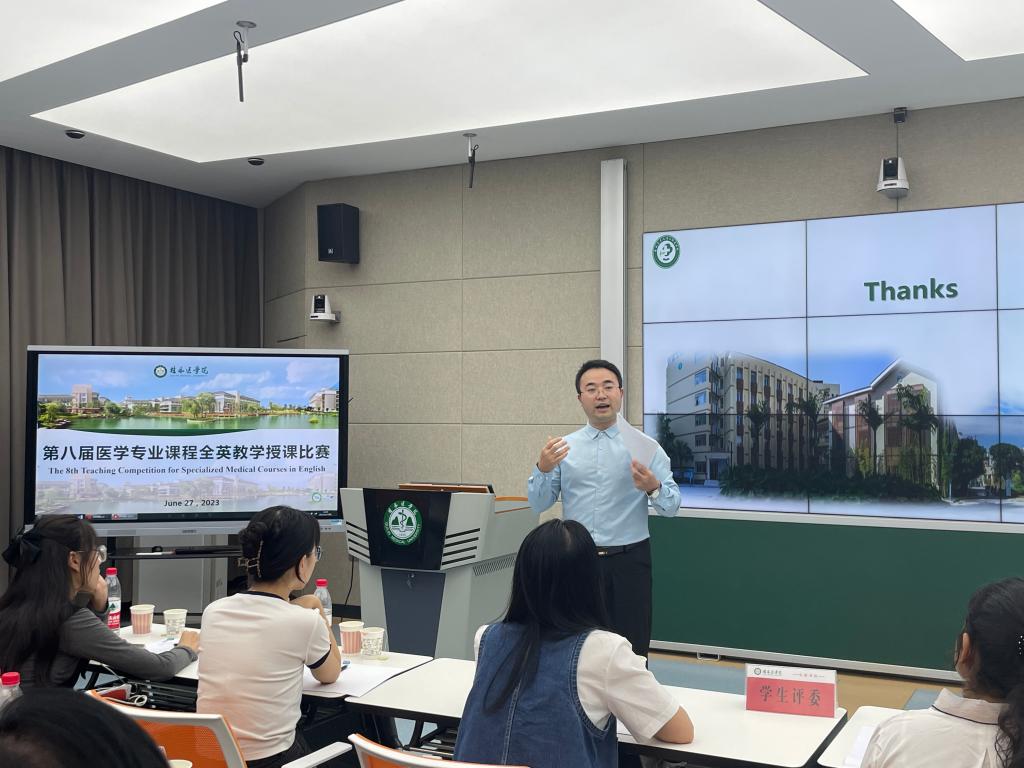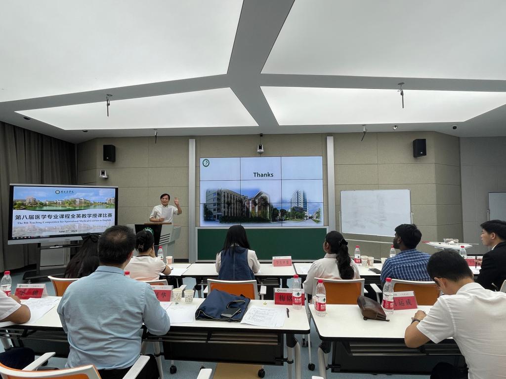 为提高我校教师英文教学能力和业务水平,推进医学教育国际化,提升留学生、研究生和本科生的教育教学质量,6月27日,教育评价与教师教学发展中心组织开展桂林医学院第八届专业课程全英教学授课比赛决赛,17名各二级学院推荐教师参加决赛。决赛评委由5位专家和6位留学生及研究生组成。相关二级学院领导、教学管理人员及教师观摩比赛。