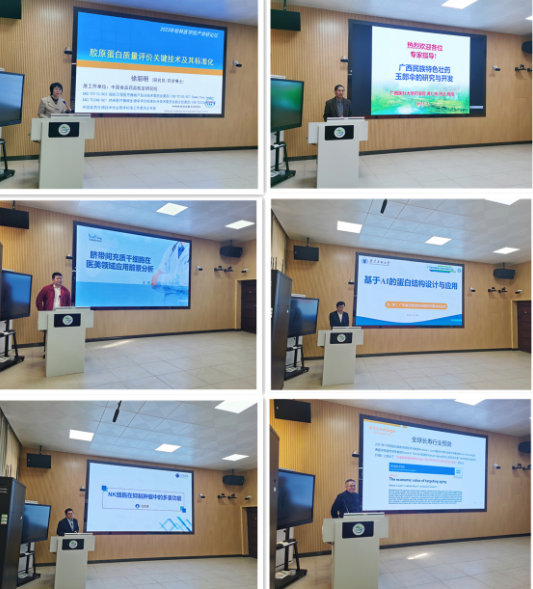 专题讲座环节,论坛邀请的多位行业专家和企业代表分别围绕所开展的研究进行了经验和成果分享,分别以“胶原蛋白质量评价关键技术及其标准化”“广西壮药玉郎伞的研究与开发”“基于AI的蛋白结构设计进展与应用”“NK细胞在抑制肿瘤中的多重功能”“脐带间充质干细胞外泌体在医美领域的应用前景分析”“通向长寿之路——百岁人群之肠道菌群”等为题进行了介绍,展示了部分产业的研究热点与相关应用前景。