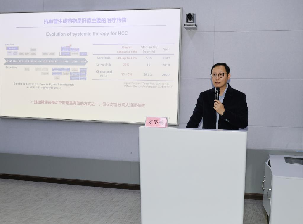 方坚鸿教授作了题为“血管结构异质性在肝癌临床合理用药中的应用”的学术讲座,介绍了新型肿瘤包绕型血管的功能和临床意义,详细阐述了血管结构异质性调控肝癌转移的机制研究,并提出了基于血管结构异质性的个体化肝癌治疗方案。此外,他还阐述了果糖对于肝脏代谢疾病的调控作用。他的研究思路及方法让在场人员受益匪浅,激发了大家科研探索的热情。