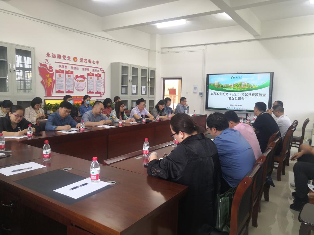 为进一步推进学校本科教育教学高质量发展,强化本科人才培养中心地位,教务处组织工作人员和专家开展了为期一周的毕业论文(设计)和试卷专项检查,并在4月2日上午组织召开反馈会。学校审核评估督察组、教务处工作人员、各相关二级学院(系)分管教学副院长和教学管理科负责人参加会议。会议由教务处负责人主持。