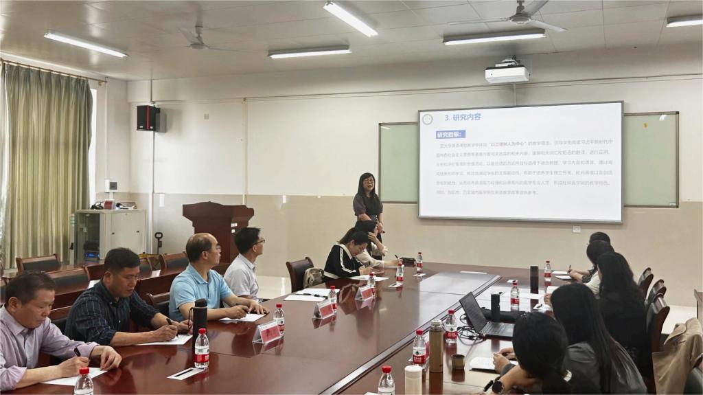 《〈理解当代中国:英语读写教程〉融入大学英语教学的实践与研究》课题主持人梁雪清陈述开题报告。她分别从研究背景、选题意义、国内研究现状、核心概念、研究目标、研究内容、主要研究方法、创新及特色之处和预期成果、研究进度等方面向专家和老师们做了详细的现场汇报。