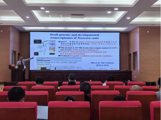 朱兴全教授首先做了题为“Multi-omics”, molecular and immunological studies of parasites and parasite-host interactions in the ZHU Lab: an overview的报告。他深入浅出地介绍了其研究团队多年来在重要人兽共患寄生虫病的感染与致病机制方面的研究成果,包括人和动物寄生虫感染的流行病学;重要寄生虫的基因组学和功能“组学”;弓形虫发育、毒力、速殖子和缓殖子表型转换及有性繁殖的分子机制等。