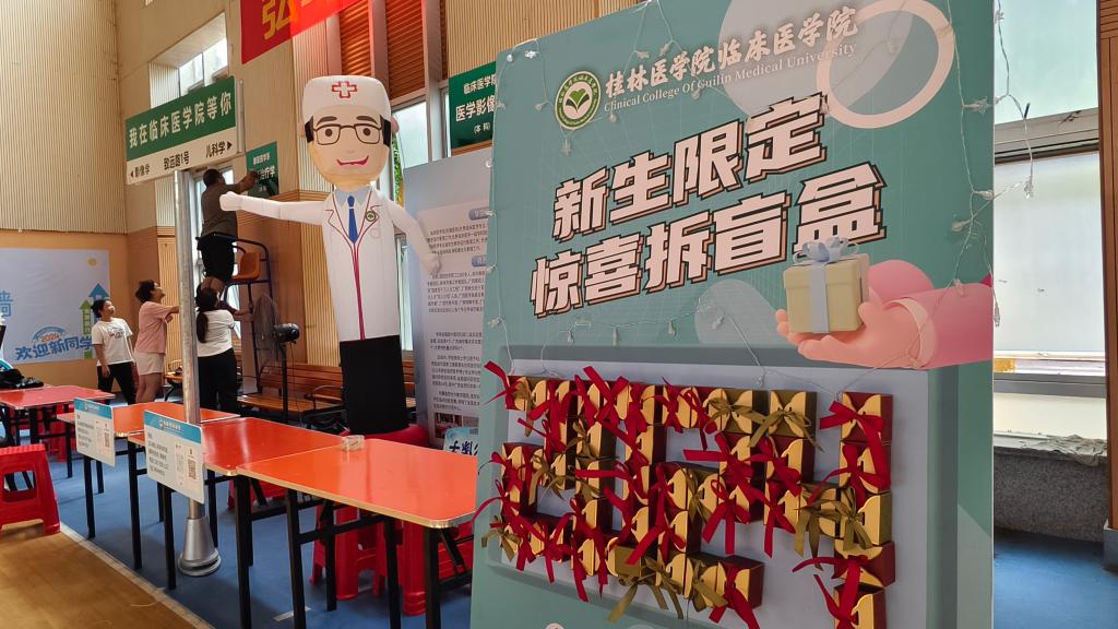 开学临近,学生工作部(处)组织各二级学院(系)围绕“焕然一‘新’,栩栩如‘生’”主题,营造热情、温馨的迎新工作氛围。通过更换宣传橱窗内容,展示学院(系)大学生思想政治教育成果;精心布置迎新大本营,融合专业特色;规范培训志愿者,做好新生领路人等活动,为新生们积极打造属于桂医的温馨迎新现场。迎新当天,学生工作部(处)设计制作的大型立体美陈,吸引众多新生及家长驻足留影。各二级学院(系)迎新大本营服务也凝聚匠心:临床医学院设置抽盲盒活动,吸引新生参与,并准备了大学英语词汇必背、定制笔记本等实用奖品;药学院联合校友提供解暑饮品——酸梅汁,备受好评。