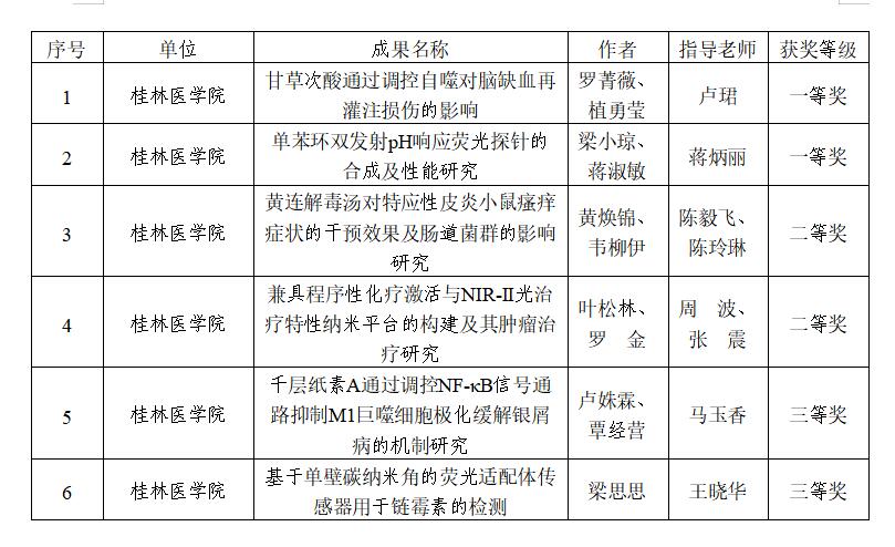 近日,广西壮族自治区教育厅的广西本科教育网公布“公示第二十五届广西高校大学生化学化工类学术创新成果大赛评审结果”,我校药学院获一等奖2项、二等奖1项、三等奖2项,智能医学与生物技术学院获二等奖1项。