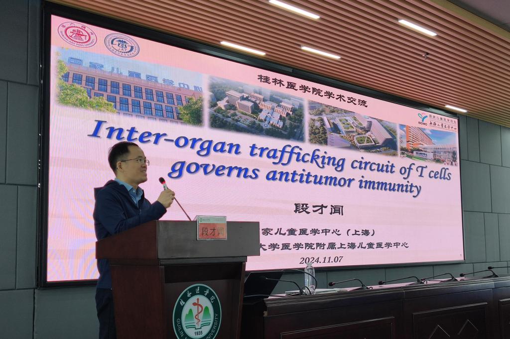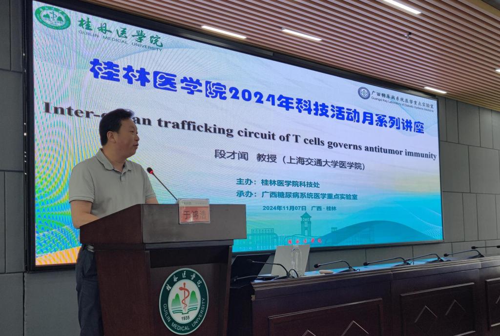 11月7日,上海交通大学段才闻教授应广西糖尿病系统医学重点实验室的邀请,在我校临桂校区科学实验中心一楼报告厅做了一场题为“Inter-organ trafficking circuit of T cells governs antitumor immunity”的专题报告,报告会由学校科技处副处长于鸿浩教授主持,各重点实验室的科研人员及师生代表近200人到现场参与交流。