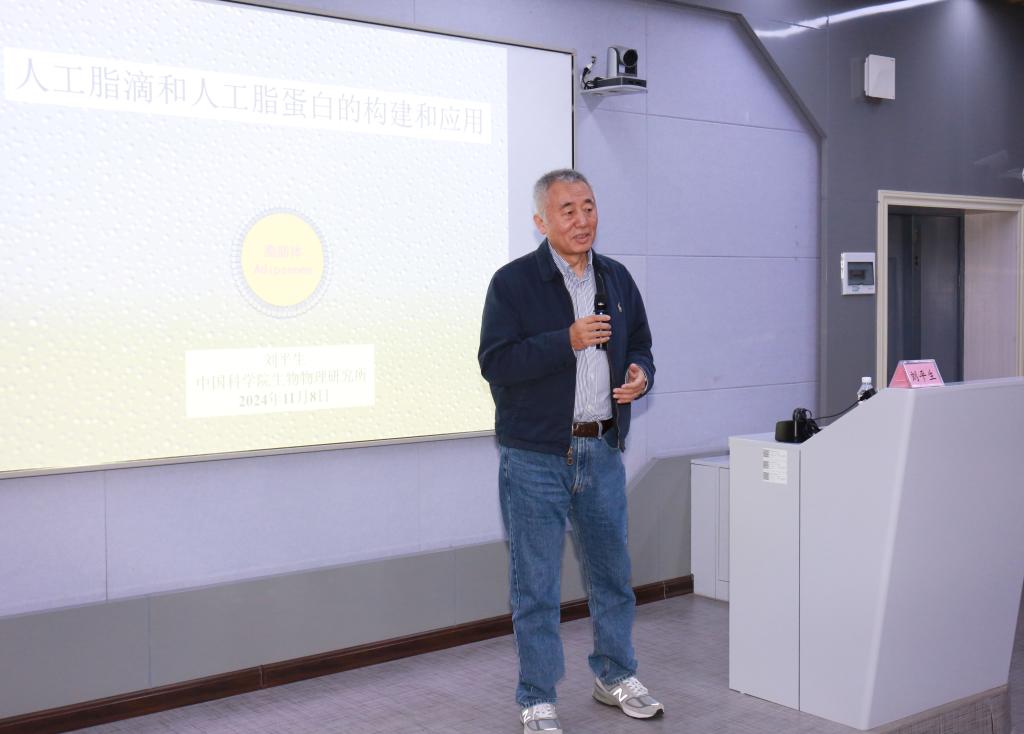 刘平生教授作了题为“脂肪体在脂滴研究和制药中的应用”的学术讲座。刘教授详细讲解了脂肪体的概念、制备的方法以及在药物递送、疫苗设计、抗体制备等方面的应用。刘教授的讲座精彩且风趣幽默,他的研究思路及成果更是让在场人员受益匪浅。