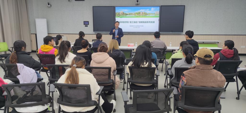 11月30日,2024年桂林医学院科技活动月系列活动暨大学生“医工融合”创新挑战系列竞赛决赛在教学北楼智慧教室N409举行。本次竞赛由桂林医学院科技处主办,智能医学与生物技术学院和桂林电子科技大学人工智能学院联合承办。智能医学与生物技术学院院长孙立元、副院长高进涛,两校专家评委、参赛选手现场参与活动。