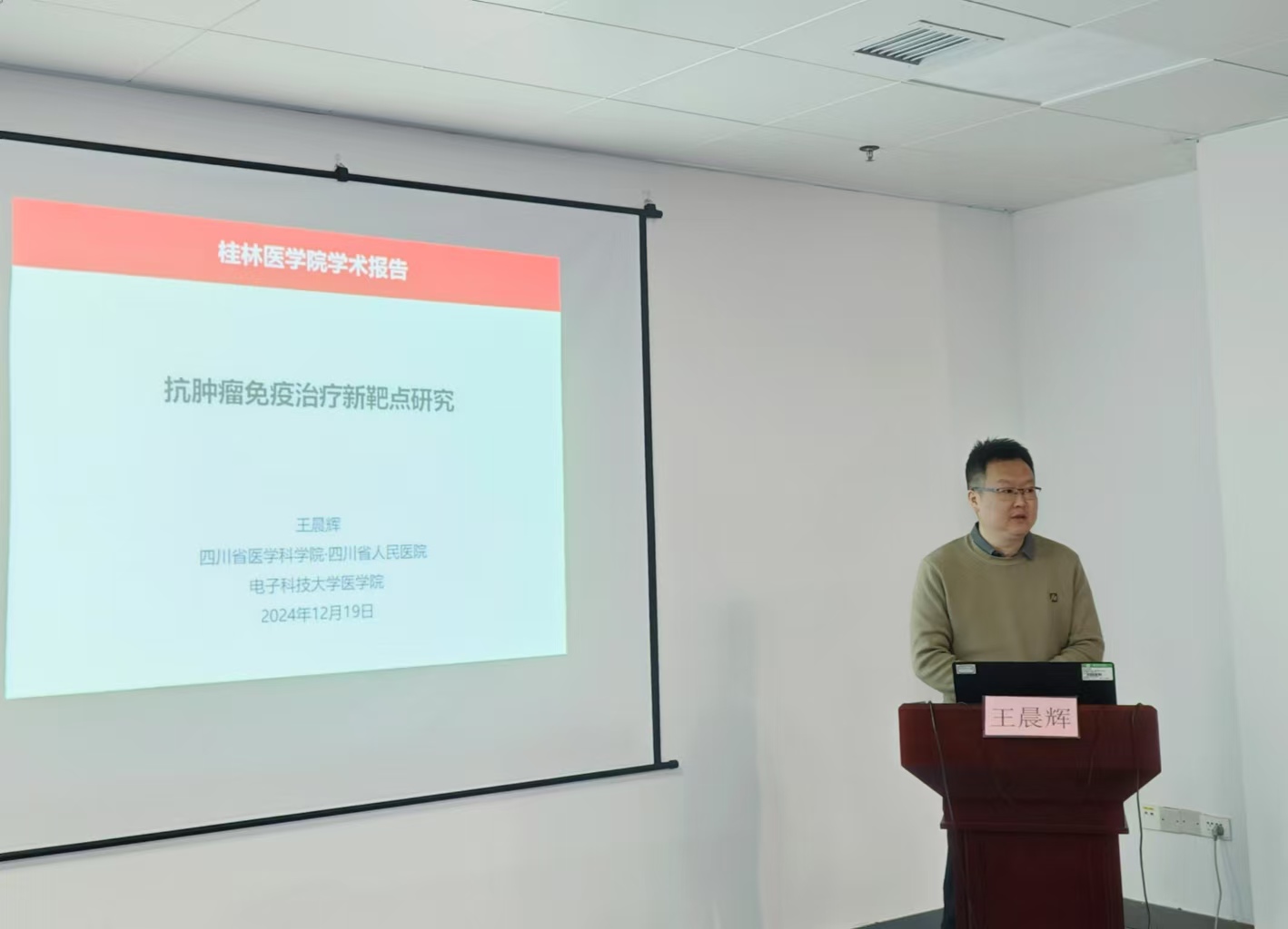 12月19日上午,电子科技大学王晨辉教授应广西糖尿病系统医学重点实验室及广西肿瘤免疫与微环境调控重点实验室的邀请,在我校临桂校区科学实验中心7楼会议室作了题为“疾病免疫治疗新靶点研究”的专题报告,学校重点实验室相关科研人员及研究生50余人到场交流,报告会由基础医学院副院长黎荣主持。
