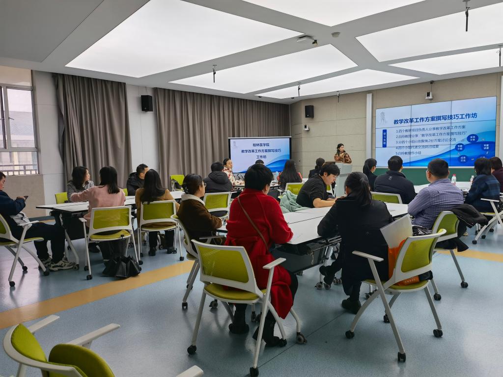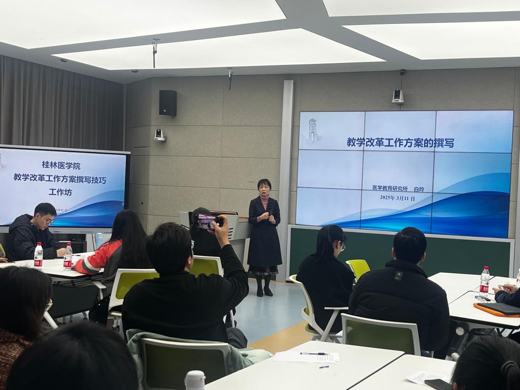 为进一步夯实教学改革研究的实践过程,助力教师教学改革举措落实落地,促进教育教学研究与改革项目有计划、高质量完成,3月11日下午,教育评价与教师教学发展中心在临桂校区教学北楼N411智慧教室开展教学改革工作方案撰写工作坊。工作坊由医学教育研究所白玲教授主持。2024年校级教育教学研究与改革项目负责人或骨干成员20余人参加本次培训。