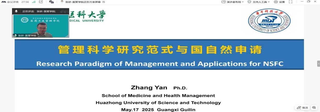 张研以《管理科学研究范式与国自然申请》为题,从研究范式出发,分析了社会科学与自然科学的研究旨趣与问题意识;并结合管理科学的具体案例,详细讲解了国家自然科学基金课题的评审标准与申报技巧。