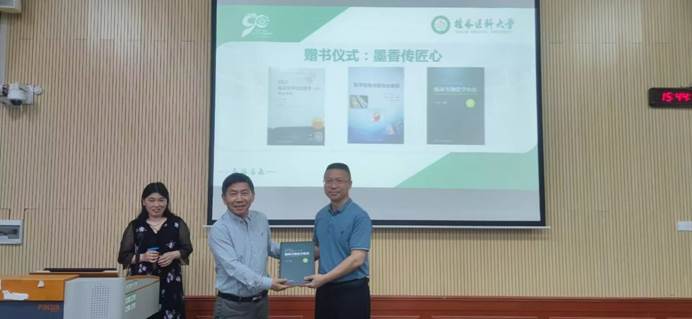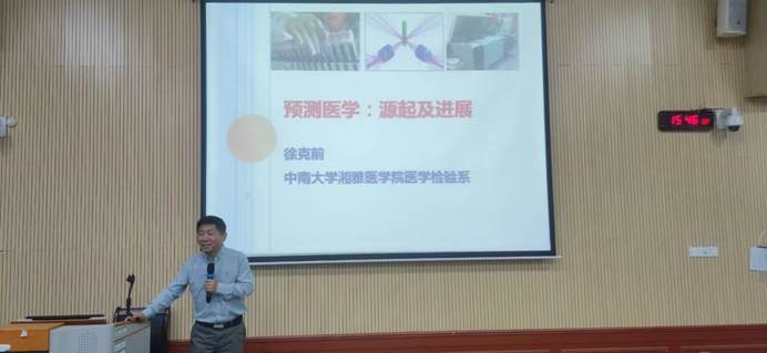 活动伊始,医学检验学院院长刘洪波教授致辞,并代表学院接受徐克前教授赠送的专业书籍。随后徐教授以《预测医学:源起及进展》为主题,向现场的师生们系统阐述了预测医学的定义、发展历程及其与“治未病”理念的关联,深入剖析了预测方法的应用现状及面临的伦理挑战,为师生提供了跨学科研究的新视角。