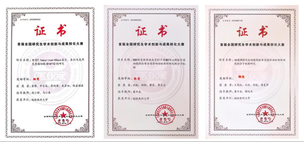 本次大赛以“立德树人、学术创新、成果转化”为主题,以硕、博士研究生为主体,通过学术竞赛的形式,搭建“产学研用”交流合作平台,助力广大青年就业、创业、深造。我校参赛的三个项目全部获奖,其中,莫中成教授指导的项目“NOD样受体家族成员X1介导MOTS-c调控巨噬细胞线粒体自噬影响动脉粥样硬化的分子机制”项目获得银奖,段小群教授指导的项目“新型F.heparinum-HAase鉴定、表征及抗黑色素瘤细胞(B16F10)的研究”和莫中成教授、谢远杰副教授共同指导的项目“烟碱调控内皮细胞线粒体自噬促动脉粥样硬化的分子机制研究”均获得铜奖。