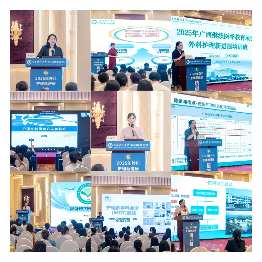 本次培训班特邀中华护理学会常务理事、广西护理学会党支部书记、理事长傅桂芬、广西医科大学第二附属医院党委副书记黄惠桥、广西医科大学第一附属医院护理部副主任游雪梅、桂林市人民医院护理部主任周燕、中南大学湘雅二医院桂林医院护理部主任陶亚鑫等专家,共话专业、共谋发展。培训内容丰富,聚焦护理人员执行力的思与行、护士人文领导力双性提升思考、护理论文阅读技巧与方法、多学科护理会诊(MDT)的临床实践、创新专科护士培养助力护理质量提升等,通过主旨演讲、专题报告等形式,把脉专业趋势、畅通学科建设、探讨护理管理,旨在分享研究成果和实践经验,激发护理同仁们的创新动力。