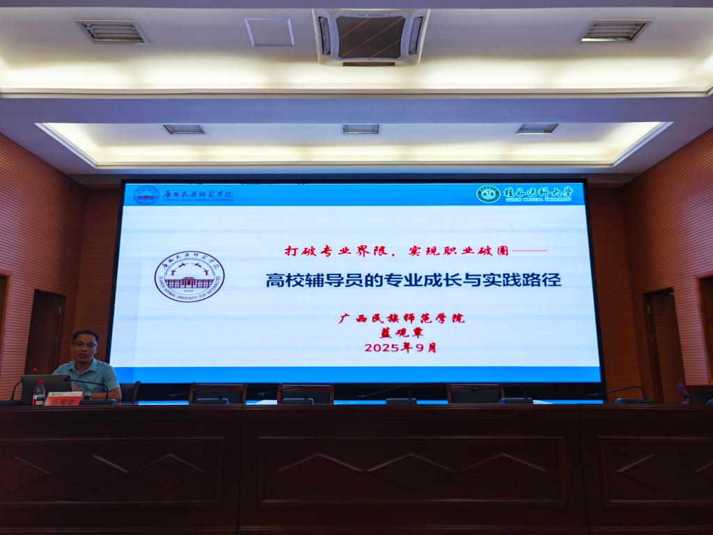 9月18日下午,我校在临桂校区明德楼101会议室开展第二十二期学工领航讲坛。广西民族师范学院专职辅导员蓝观覃副教授应邀担任主讲嘉宾,作了《打破专业界限,实现职业破圈:高校辅导员的专业成长与实践路径》专题报告。学生工作部、研究生工作部、校团委全体人员,各学院(系)分管学生工作负责人及全体专兼职辅导员参加讲坛。