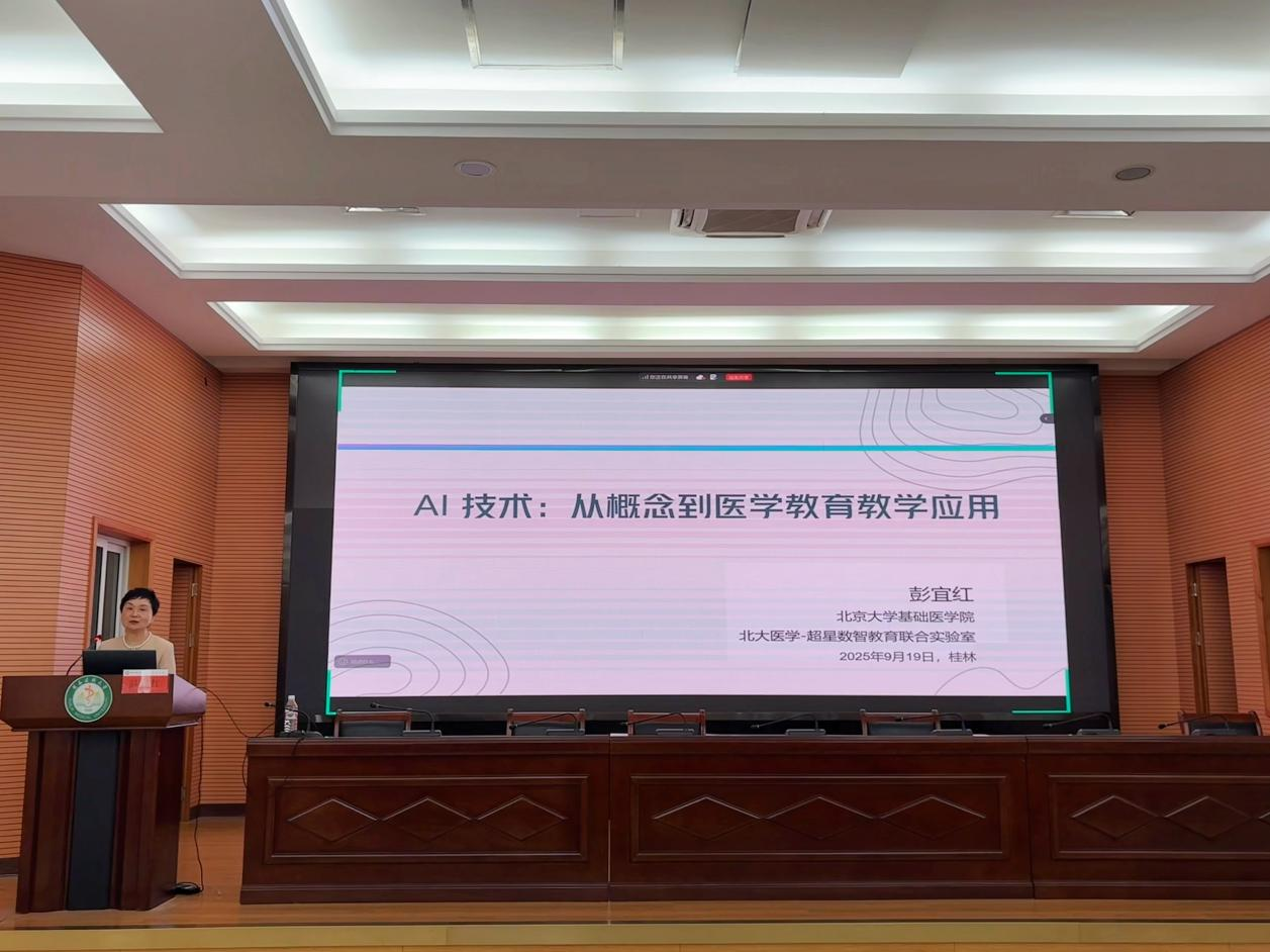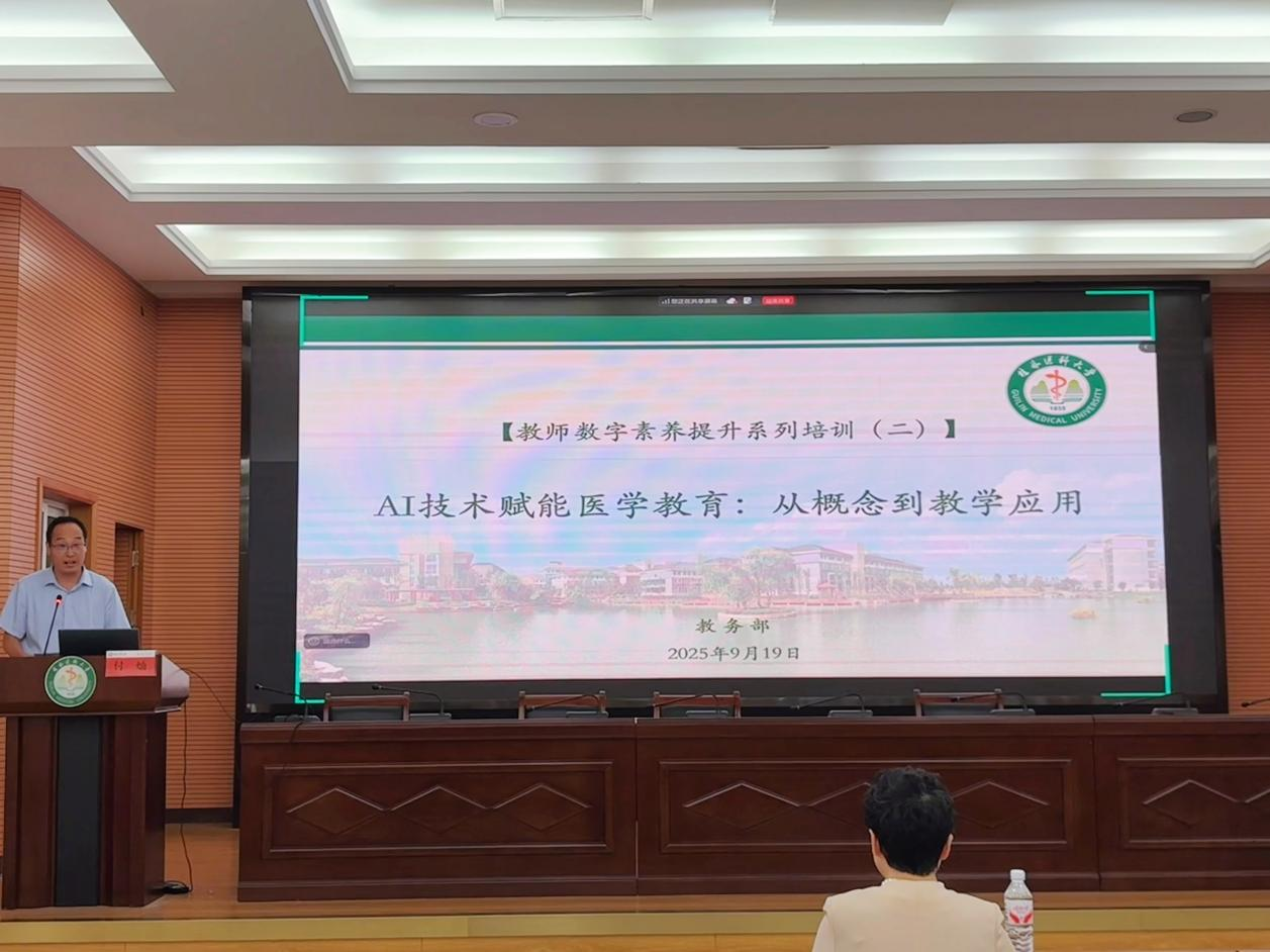 9月19日,我校在临桂校区明德楼101报告厅举办教师数字素养提升系列培训第二场活动,主题为“AI技术赋能医学教育:从概念到教学应用”,讲座采用线上线下相结合方式开展,吸引了来自学校一线教师、教学督导及教学管理人员等100余人参加。